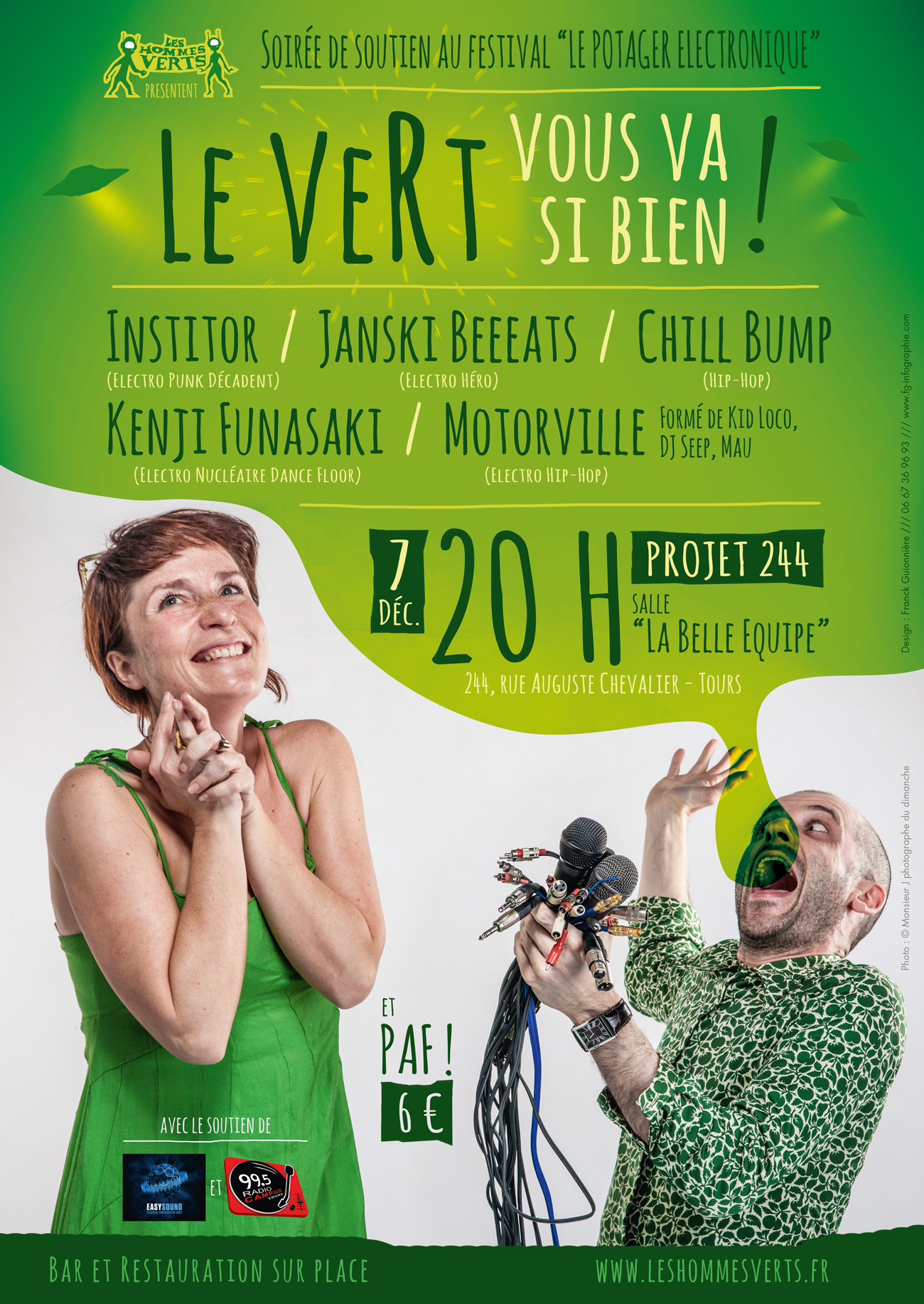 Les Hommes Verts m’ont demandé de leur prêter main forte pour créer l’affiche servant à ramener un maximum de gens à l’évènement et ainsi rassembler des fonds pour faire perdurer le festival musical annuel du « Potager Electronique ». Mission accomplie, on aura la joie de découvrir ou redécouvrir des groupes musicaux talentueux aussi longtemps que possible, je l’espère.